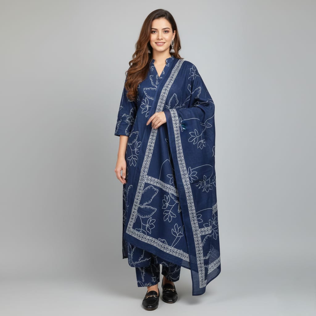 SALWAR SUIT COTTON DARK BLUE WITH WHITE PRINT