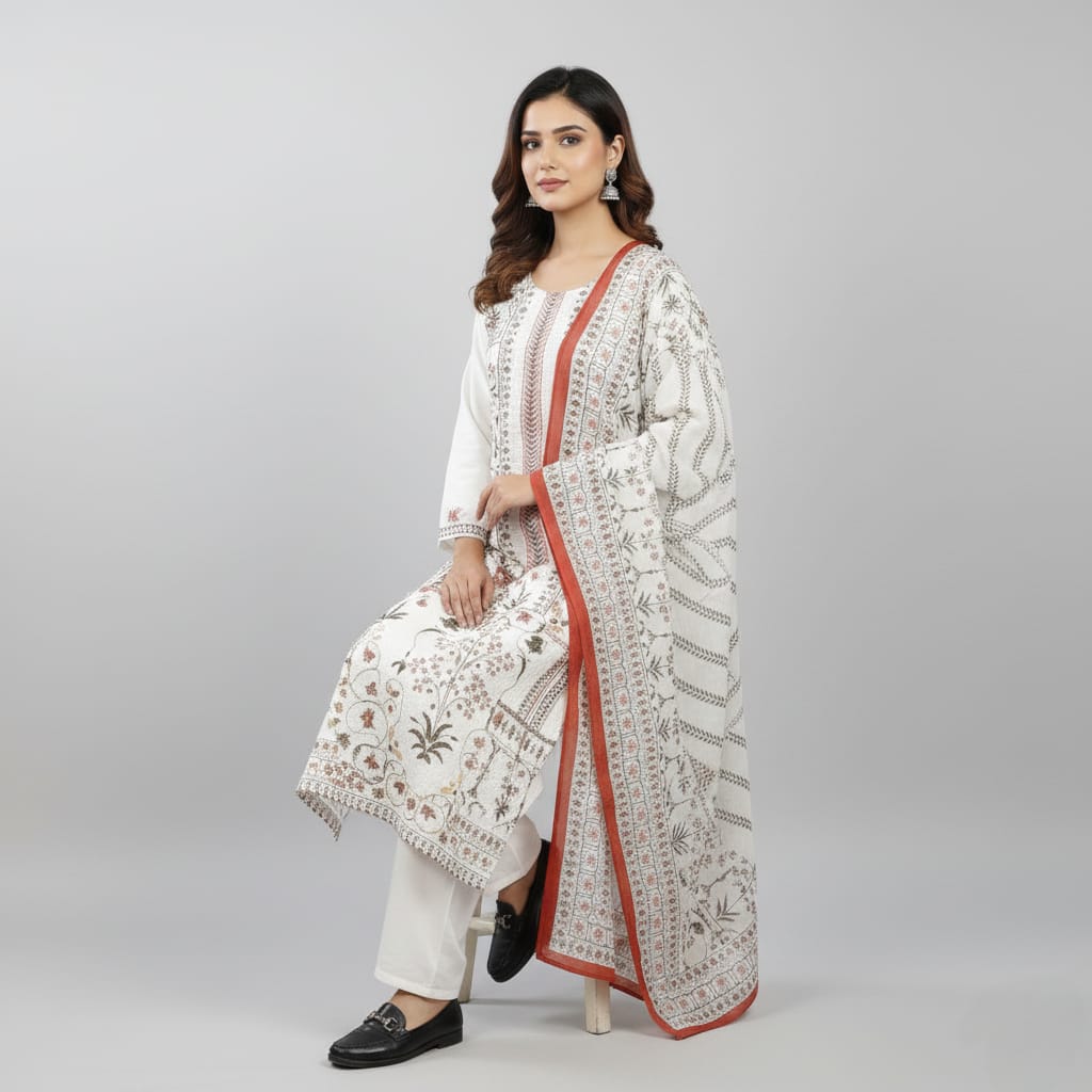 Elevate your everyday wardrobe with this classic white cotton salwar suit, crafted for comfort and versatility. The breathable cotton fabric ensures all-day ease, making it ideal for both casual outings and semi-formal occasions. Paired with a beautifully printed dupatta, this ensemble adds an elegant finishing touch that transitions seamlessly from day to evening wear. The timeless white base serves as a perfect canvas for accessorizing, while the intricate dupatta design brings visual interest and sophistication. Perfect for those who appreciate traditional Indian fashion with contemporary appeal.