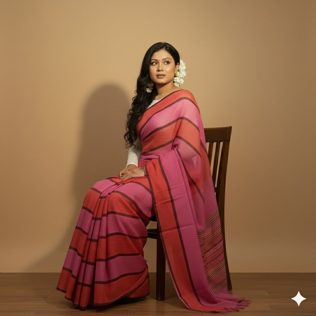 Elevate your ethnic wardrobe with this exquisite Mulmul saree featuring striking red stripes. Crafted from premium mulmul fabric, known for its lightweight breathability and soft drape, this saree offers unparalleled comfort for all-day wear. The bold red stripe pattern adds contemporary flair to traditional styling, making it versatile for both casual gatherings and festive occasions. Perfect for those seeking refined elegance with practical wearability, this piece seamlessly transitions from day to evening. The natural texture of mulmul ensures effortless maintenance while delivering a sophisticated, understated luxury that discerning saree enthusiasts appreciate.